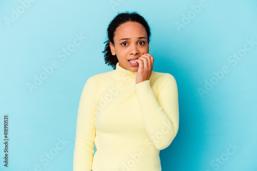 Young african american mixed race woman isolated biting fingernails, nervous and very anxious.