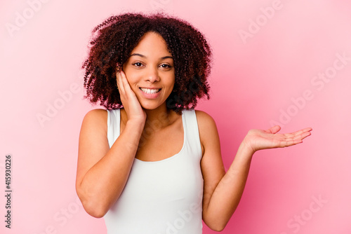 Young african american mixed race woman isolated holds copy space on a palm, keep hand over cheek. Amazed and delighted.