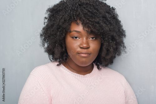 Young african american plus size woman over grey grunge wall wearing winter sweater with serious expression on face. Simple and natural looking at the camera.
