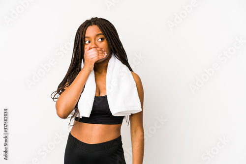 Young african american sport woman isolated thoughtful looking to a copy space covering mouth with hand.