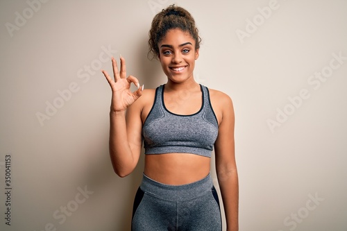 Young african american sportswoman doing sport wearing sportswear over white background smiling positive doing ok sign with hand and fingers. Successful expression.