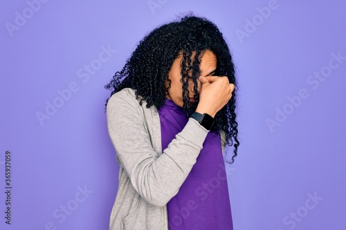 Young african american sporty woman wearing casual sweatshirt over purple background tired rubbing nose and eyes feeling fatigue and headache. Stress and frustration concept.