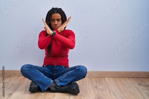 Young african american with braids sitting on the floor at home rejection expression crossing arms doing negative sign, angry face