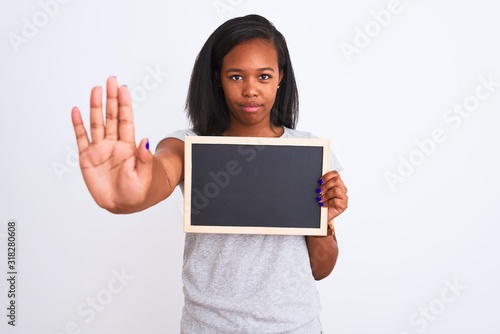 Young african american woman holding blank school blackboard over isolated background with open hand doing stop sign with serious and confident expression, defense gesture