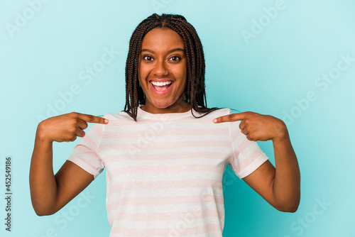 Young african american woman isolated on blue background surprised pointing with finger, smiling broadly.