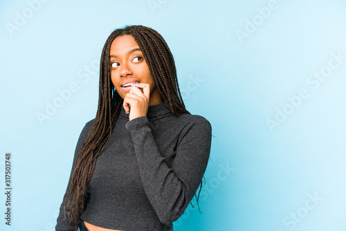 Young african american woman isolated on blue background relaxed thinking about something looking at a copy space.
