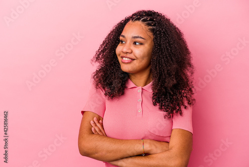 Young african american woman isolated on pink background smiling confident with crossed arms.