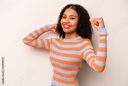 Young African American woman isolated on white background celebrating a special day, jumps and raise arms with energy.