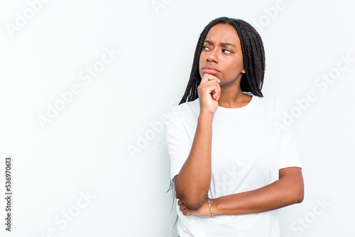 Young African American woman isolated on white background looking sideways with doubtful and skeptical expression.
