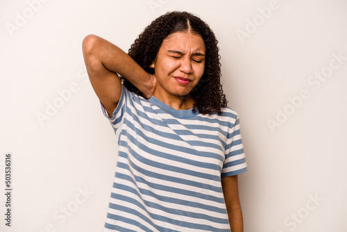 Young African American woman isolated on white background suffering neck pain due to sedentary lifestyle.