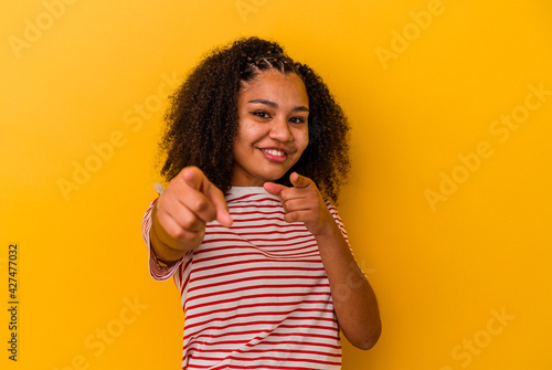 Young african american woman isolated on yellow background cheerful smiles pointing to front.