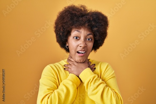 Young african american woman standing over yellow background shouting and suffocate because painful strangle. health problem. asphyxiate and suicide concept.
