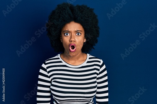 Young african american woman wearing casual clothes afraid and shocked with surprise expression, fear and excited face.