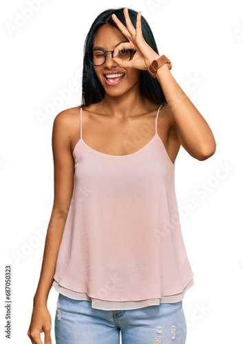 Young african american woman wearing casual clothes and glasses doing ok gesture with hand smiling, eye looking through fingers with happy face.