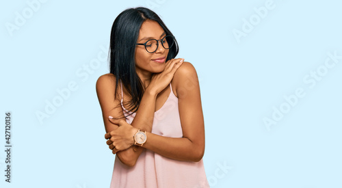 Young african american woman wearing casual clothes and glasses hugging oneself happy and positive, smiling confident. self love and self care