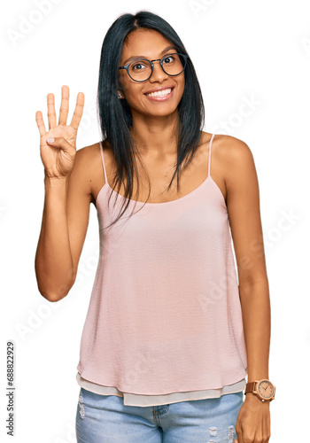 Young african american woman wearing casual clothes and glasses showing and pointing up with fingers number four while smiling confident and happy.