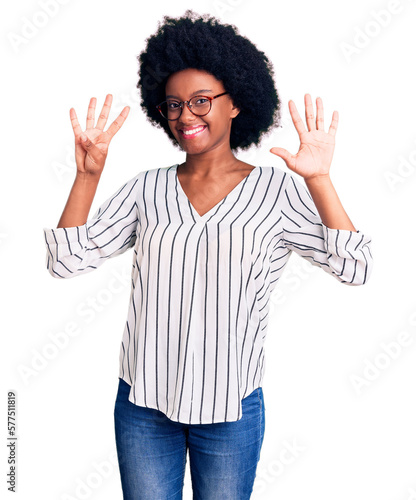 Young african american woman wearing casual clothes and glasses showing and pointing up with fingers number nine while smiling confident and happy.
