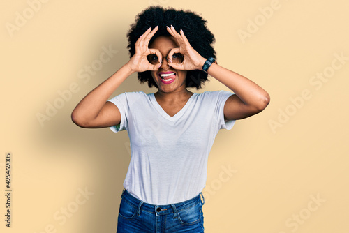 Young african american woman wearing casual white t shirt doing ok gesture like binoculars sticking tongue out, eyes looking through fingers. crazy expression.
