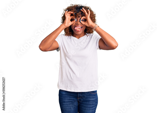 Young african american woman wearing casual white tshirt doing ok gesture like binoculars sticking tongue out, eyes looking through fingers. crazy expression.