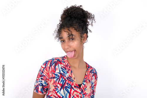 Young African American woman wearing colourful dress over white wall with happy and funny face smiling and showing tongue.