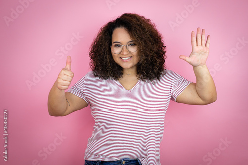 Young african american woman wearing red stripes t-shirt over pink background showing and pointing up with fingers number six while smiling confident and happy