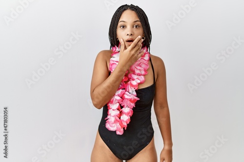 Young african american woman wearing swimsuit and hawaiian lei looking fascinated with disbelief, surprise and amazed expression with hands on chin