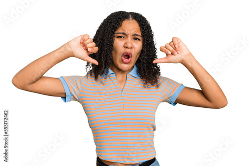 Young african american woman with curly hair cut out isolated feels proud and self confident, example to follow.