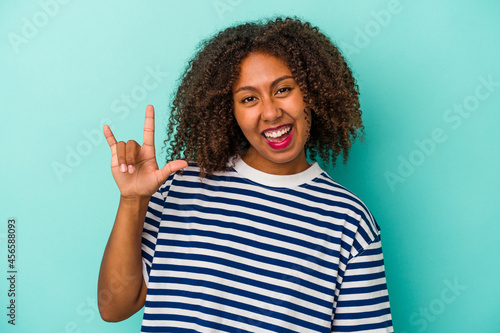 Young african american woman with curly hair isolated on blue background showing a horns gesture as a revolution concept.