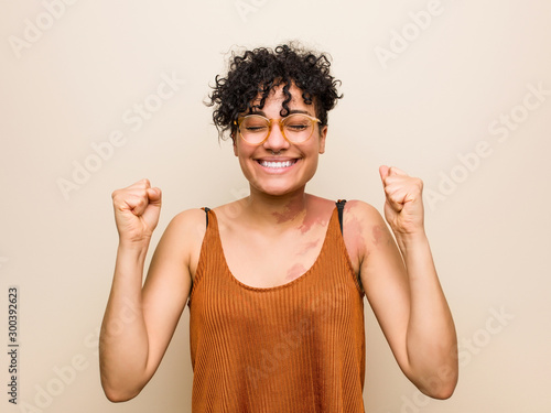Young african american woman with skin birth mark raising fist, feeling happy and successful. Victory concept.