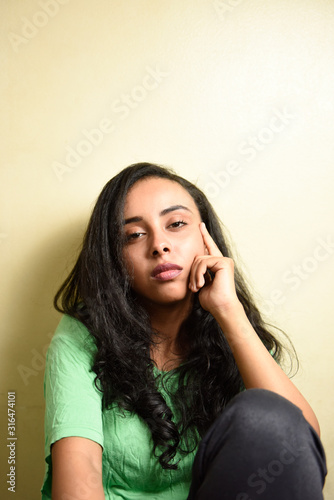 Young african woman wearing shirt over on colorful wood background thinking looking tired and bored with depression problems