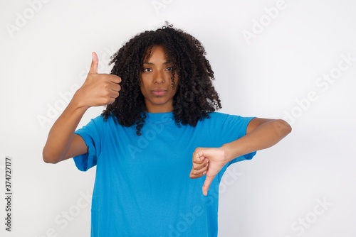 Young african woman with curly hair wearing casual blue shirt over white background showing thumbs up and thumbs down, difficult choose concept