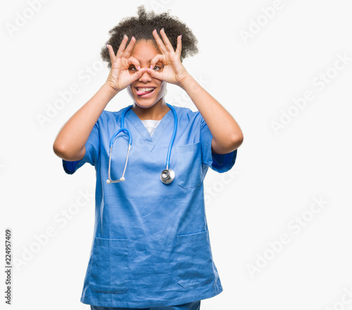 Young afro american doctor woman over isolated background doing ok gesture like binoculars sticking tongue out, eyes looking through fingers. Crazy expression.