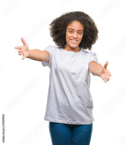 Young afro american woman over isolated background looking at the camera smiling with open arms for hug. Cheerful expression embracing happiness.