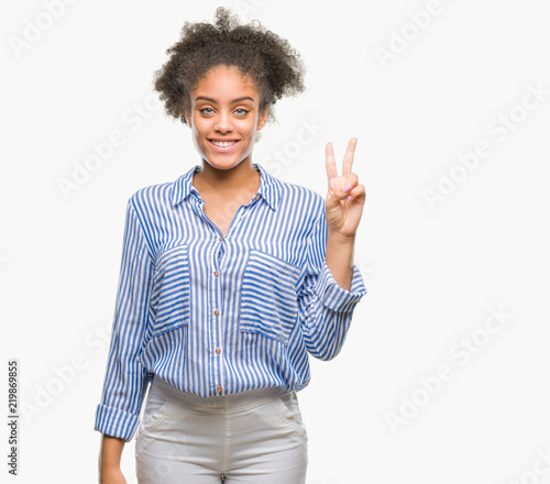 Young afro american woman over isolated background showing and pointing up with fingers number two while smiling confident and happy.