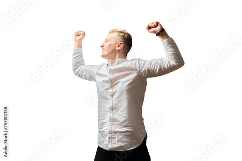 young ambitious happy businessman in white shirt isolated