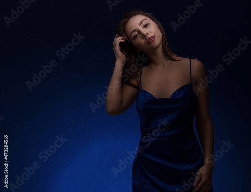 Young and cute brunette woman in blu dress posing on dark blue background free space for text
