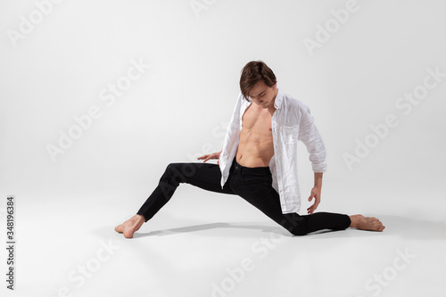 Young and graceful ballet dancer in minimal black style isolated on white studio background. Art, motion, action, flexibility, inspiration concept. Flexible caucasian ballet dancer, weightless jumps.
