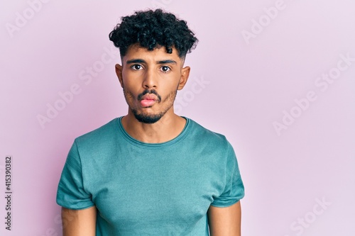 Young arab handsome man wearing casual clothes making fish face with lips, crazy and comical gesture. funny expression.