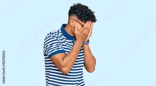 Young arab man wearing casual clothes and glasses with sad expression covering face with hands while crying. depression concept.