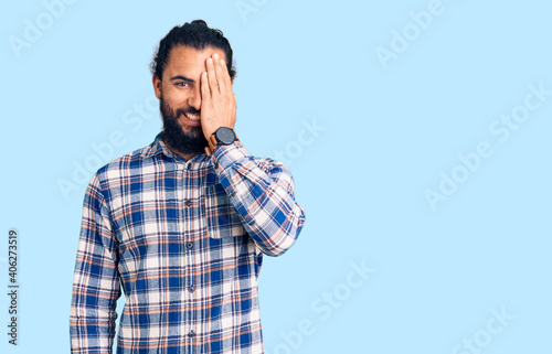 Young arab man wearing casual clothes covering one eye with hand, confident smile on face and surprise emotion.