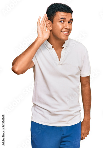 Young arab man wearing casual clothes smiling with hand over ear listening an hearing to rumor or gossip. deafness concept.