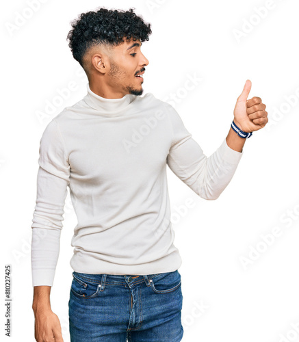 Young arab man wearing casual winter sweater looking proud, smiling doing thumbs up gesture to the side