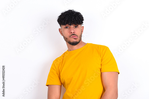 young arab man wearing yellow T-shirt over white background making grimace and crazy face, screaming out of control, funny lunatic expressing freedom and wild.