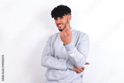 young arab man with curly hair wearing sport sweatshirt over white background Beckoning come here gesture with hand inviting welcoming happy and smiling