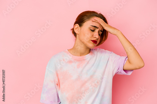 Young arab mixed race woman touching temples and having headache.
