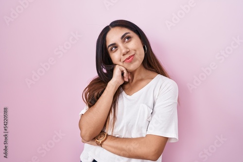 Young arab woman standing over pink background with hand on chin thinking about question, pensive expression. smiling with thoughtful face. doubt concept.