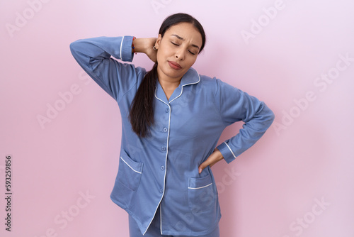 Young arab woman wearing blue pajama suffering of neck ache injury, touching neck with hand, muscular pain