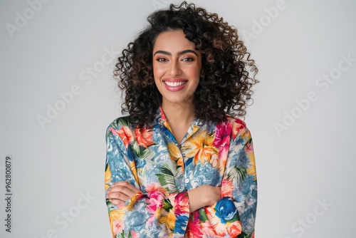 Young arab woman with curly hair stands proudly in casual attire. Floral shirt adds colorful touch. Happy face with crossed arms and confident smile. Attractive female portrait on white background.