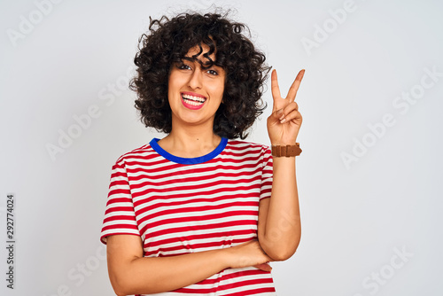 Young arab woman with curly hair wearing striped t-shirt over isolated white background smiling with happy face winking at the camera doing victory sign. Number two.