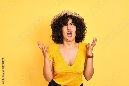 Young arab woman with curly hair wearing t-shirt and hat over isolated yellow background crazy and mad shouting and yelling with aggressive expression and arms raised. Frustration concept.
